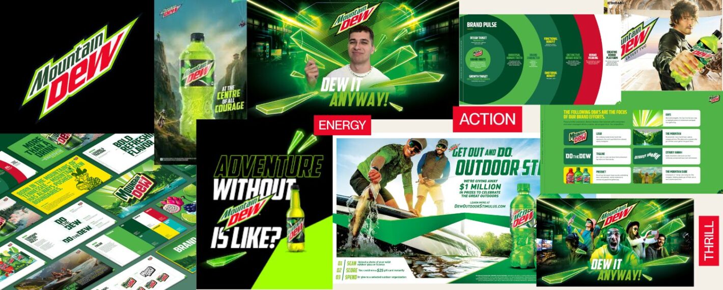 Mountain Dew focuses on energy, thrill, and action. Its branding highlights adventure, gaming, and extreme sports.