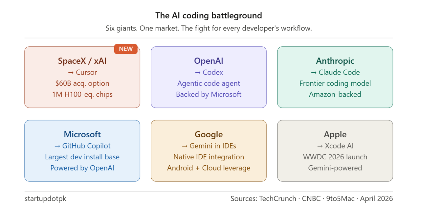 OpenAI has Codex. Anthropic has Claude. Google has Gemini baked into IDEs. Microsoft owns GitHub Copilot. And now SpaceX/xAI wants Cursor. Whoever wins developers wins enterprise. That’s the bet being placed here.